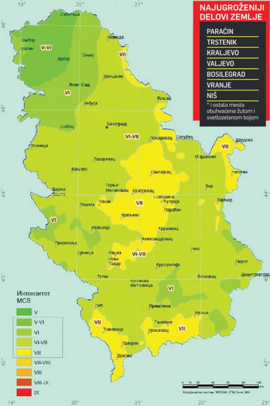 Seizmološki zavod je objavio mapu koja definiše maksimalnu jačinu zemljotresa u celoj Srbiji, po čemu bi se reklo da našoj zemlji ne preti ni približno jak potres kakvi se, nažalost, mogu očekivati u okruženju. Opasnost od zemljotresa u Srbiji izražena je najviše u Šumadiji, Rudničkom i Kolubarskom okrugu, o čemu svedoče i istorijski događaji. Ta ista istorija svedoči i da na našem prostoru ne prete zemljotresi jači od šest stepeni Merkalija. To je 100 puta manje pomeranje od onog koje je zadesilo Tursku, kaže seizmolog Slavica Radovanović.