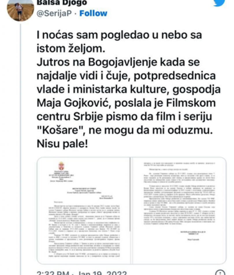 Đogo je na svom Twitter nalogu objavio post u kome je napisao da je snimanje njegovog filma obustavio njegov školski drug Vučić.