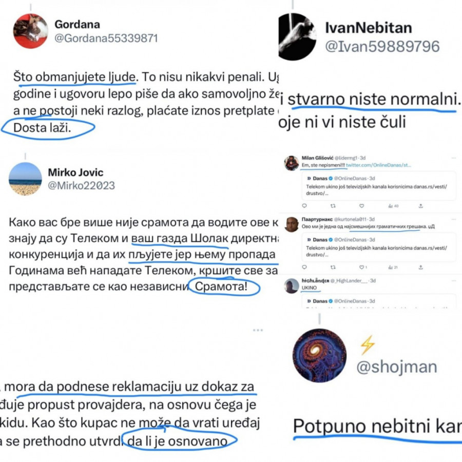 Ponašanje N1, Nove i Danasa, odnosno Dragana Šolaka i Junajted grupe, jedan “tviteraš” je najbolje opisao ovom porukom: “Kako vas, bre, više nije sramota da vodite ove kampanje?! Pa, svi znaju da su Telekom i vaš gazda Šolak direktna biznis konkurencija i da ih pljujete jer njemu propada kompanija. Godinama već napadate Telekom, kršite sve zakone i kodekse, a predstavljate se kao nezavisni. Sramota!”.