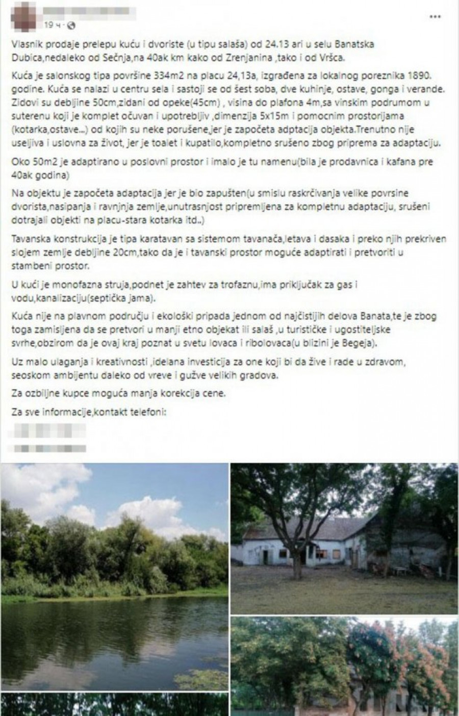"Vlasnik prodaje prelepu kuću i dvorište u tipu salaša od 24,13 ari u selu Banatska Dubica, nedaleko od Sečnja, na 40ak kilometara kako od Zrenjanina, tako i od Vršca", navodi se na početku oglasa, dok slike ispod prikazuju oronulo i zapušteno, ali veliko imanje i kuću u ne tako sjajnom stanju.