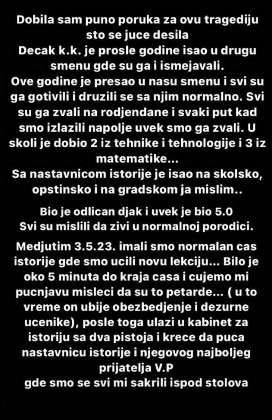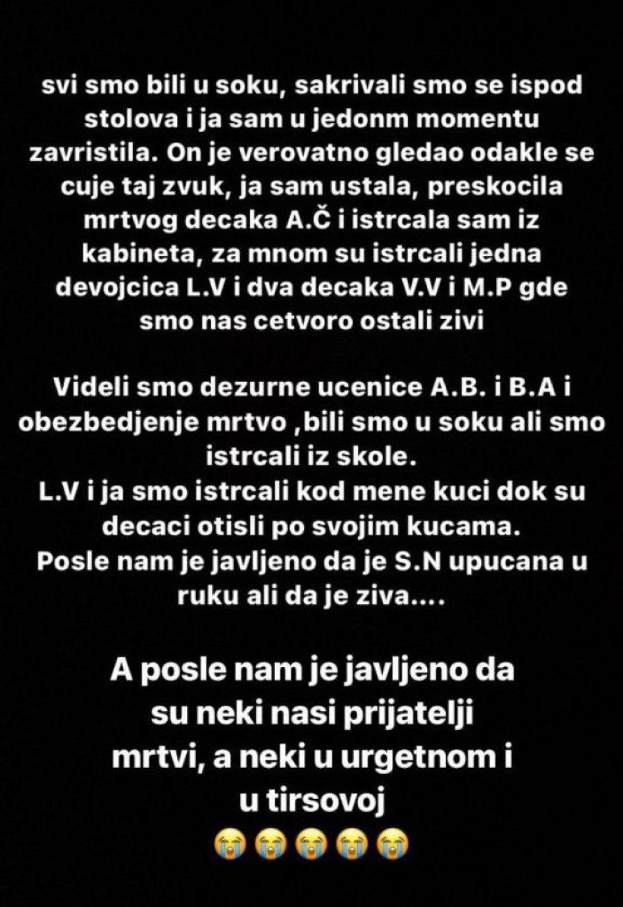 - Videli smo dežurne učenice A.B. i B.A. i obezbeđenje mrtvo, bili smo u šoku, ali smo istrčali iz škole. L.V. i ja smo istrčali kod mene kući dok su dečaci otišli svojim kućama. Posle nam je javljeno da je S.N. upucana u ruku, ali da je živa... A posle nam je javljeno da su neki naši prijatelji mrtvi, a neki u Urgentnom i Trišovoj - piše ova devojčica na Instagramu.
