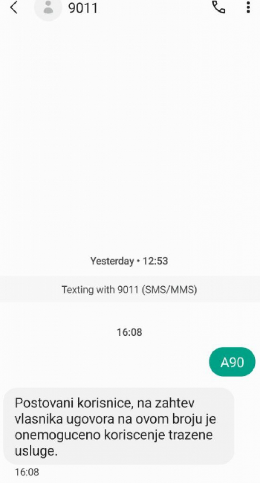 - Poštovani korisniče, na zahtev vlasnika ugovora na ovom broju je onemogućeno korišćenje tražene usluge - glasio je odgovor.