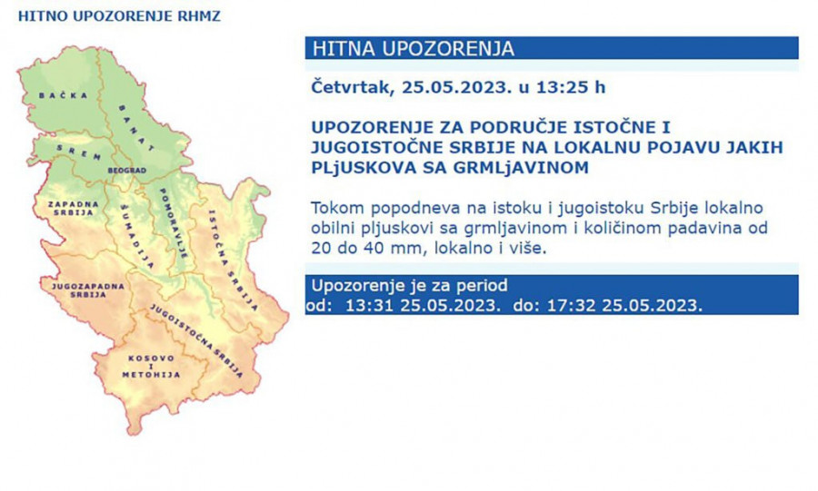 Tokom popodneva na istoku i jugoistoku Srbije lokalno obilni plјuskovi sa grmlјavinom i količinom padavina od 20 do 40 mm, lokalno i više, istaknuto je na sajtu.