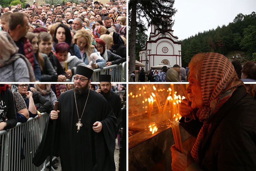 Sveštenici prolaze pored vernika ispred manastira Tumane