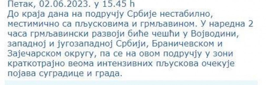 U ovim područjima se čak očekuje pojava sugradice i grada. Nevreme se očekuje oko 17:45 sa mogućnošću trajanja padavina do kraja dana.