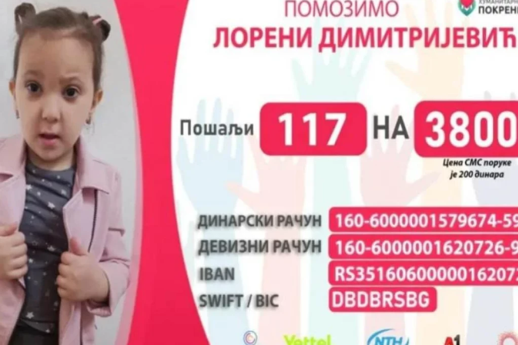 Loreni Dimitrijević iz Leskovca otkrivena je cerebralna paraliza, zbog čega ni sa 4 godine ne može da priča i hoda, a kako bi ona otišla na tretman matičnim ćelijama iz Fondacije ”Pokreni život” apeluju da je neophodno prikupiti novac.