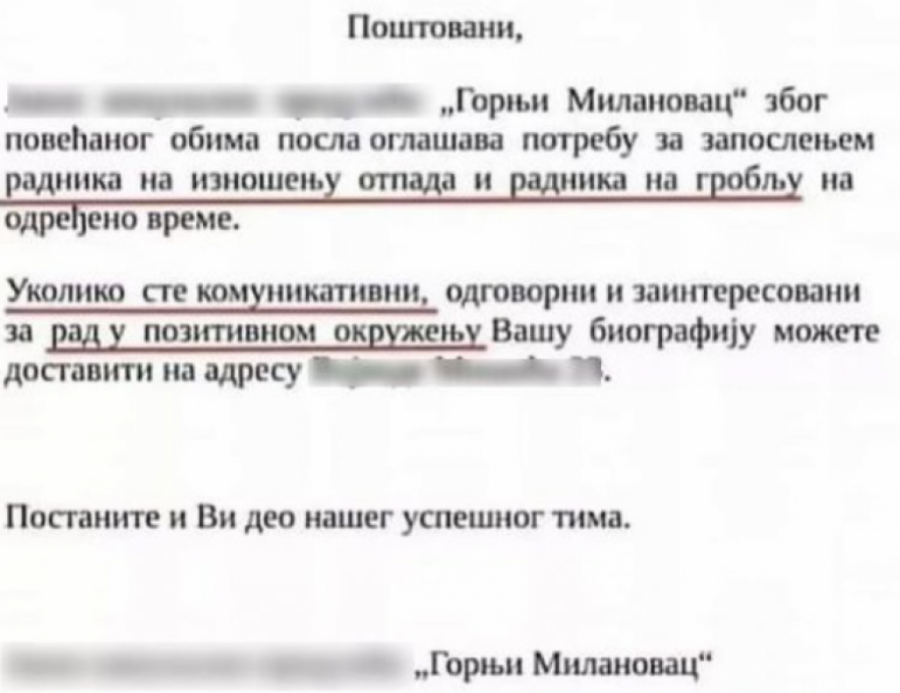 - Zbog povećanog obima posla oglašava potrebu za zaposlenjem radnika na iznošenju otpada i radnika na groblju na određeno vreme. Ukoliko ste komunikativni, odgovorni i zainteresovani za rad u pozitivnom okruženju Vašu biografiju možete dostaviti na našu adresu - glasi tekst oglasa.