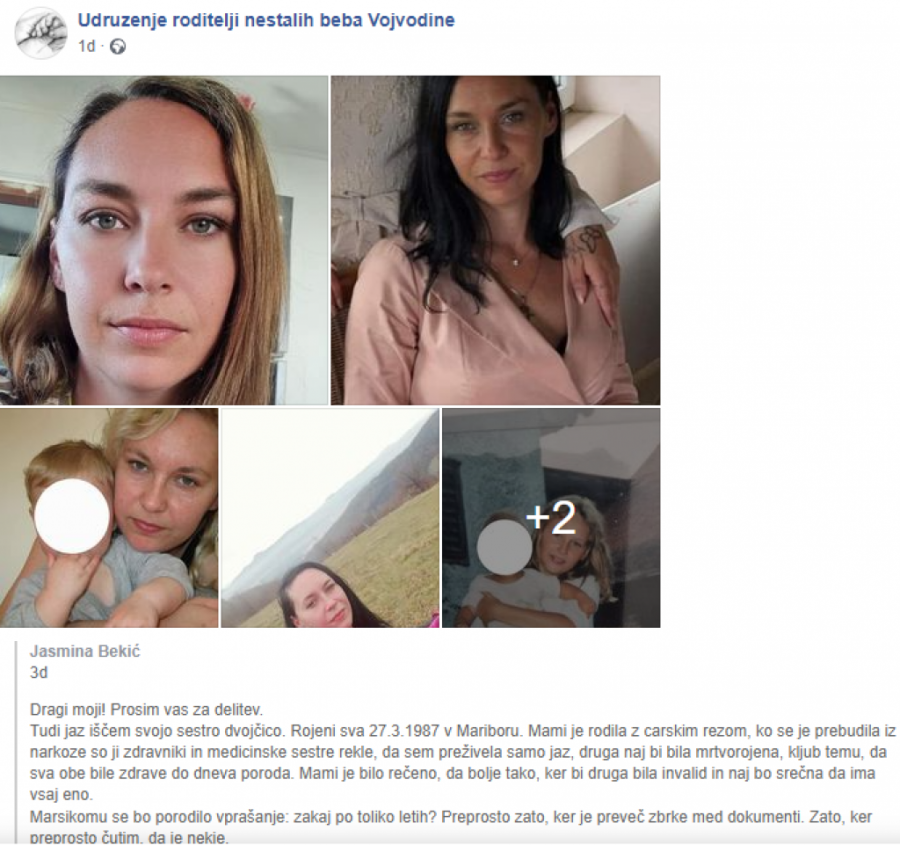 - Dragi moji! Molim vas da ovo delite jer ja tražim svoju sestru bliznakinju. Rođene smo 27.3.1987. u Mariboru. Mama se porodila carskim rezom, a kad se probudila iz anestezije lekari i medicinske sestre su joj rekli da sam preživela samo ja, a da je druga bliznakinja mrtvorođena iako smo uprkos tome obe bile zdrave u stomaku, do dana porođaja. Mami je bilo rečeno i da je tako bolje jer bi "druga bila invalid i da mam treba da bude srećna što ima mene jednu".
