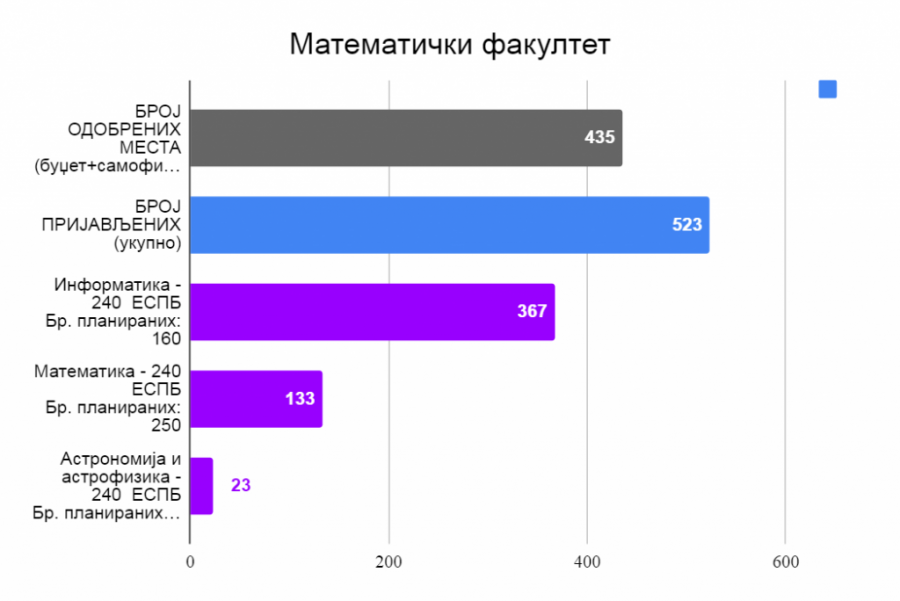 Slična je situacija i na Matematičkom fakultetu. Broj prijavljenih premašio je predviđena mesta na Informatici, ali se na smeru koji školuje profesore matematike 130 studenata prijavilo za 250 mesta.