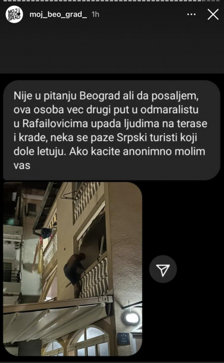 - Nije u pitanju Beograd, ali da pošaljem ova osoba već drugi put u odmaralištu u Rafailovićima upada ljudima na terase i krade, neka se paze turisti koji dole letuju - navodi se u upozorenju na Instagram stranici "Moj_beo_grad_".