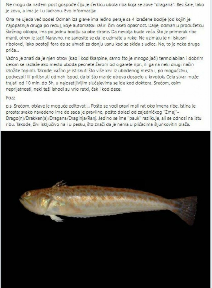 "Ne mogu da nađem post gospođe čiju je ćerkicu ubola riba koja se zove "dragana". Bez šale, tako je zovu, a ima je i u Jadranu. Evo informacija!", napisao je on.