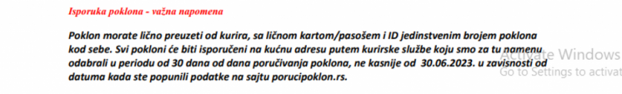 - Program lojalnosti potrošača pod nazivom "Sakupi bodove i osvoji poklone za kuhinjsku kolekciju" realizuje se u skladu sa definisanim pravilima, koja su potrošačima jasno iskomunicirana na veb-sajtu, kao i putem aplikacije. Prihvatanje pravila je i uslov za učešće u programu lojalnosti. Prema pravilima ovog programa, definisani rok za isporuku poklona je 30. jun. Imajući u vidu visok procenat do sada isporučenih poklona, verujemo i zajedno sa kurirskom službom vredno radimo na tome da i preostale poklone isporučimo potrošačima do ovog datuma. Ukoliko ostane manji broj neisporučenih poklona, isti će biti dostavljeni u dodatnih sedam radnih dana nakon prvobitnog roka. Novina ovog programa je da potrošači poklone dobijaju na kućnu adresu, čime smo izašli u susret njihovim zahtevima da, umesto da sami dolaze da preuzimaju nagrade, iste dobijaju na dostavljenu adresu. Ovo je, takođe, deo pravila, što znači da su potrošači na ista pristali samim učešćem u programu lojalnosti.