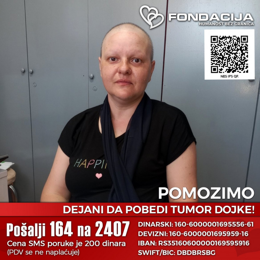 Ovim putem pozivamo sve da pomognu Dejani da pobedi tumor dojke, tako što će preko FONDACIJE – humanost bez granica poslati SMS sa brojem 164 na 2407. Uplate za pomoć u lečenju mogu se izvršiti i na dinarski i devizni račun korisnika i putem E-doniraj internet plaćanjem platnim karticama iz celog sveta, kao i preko PayPal-a.