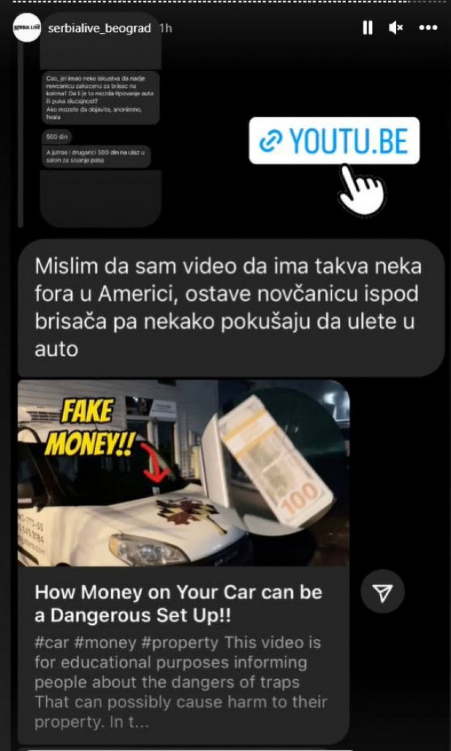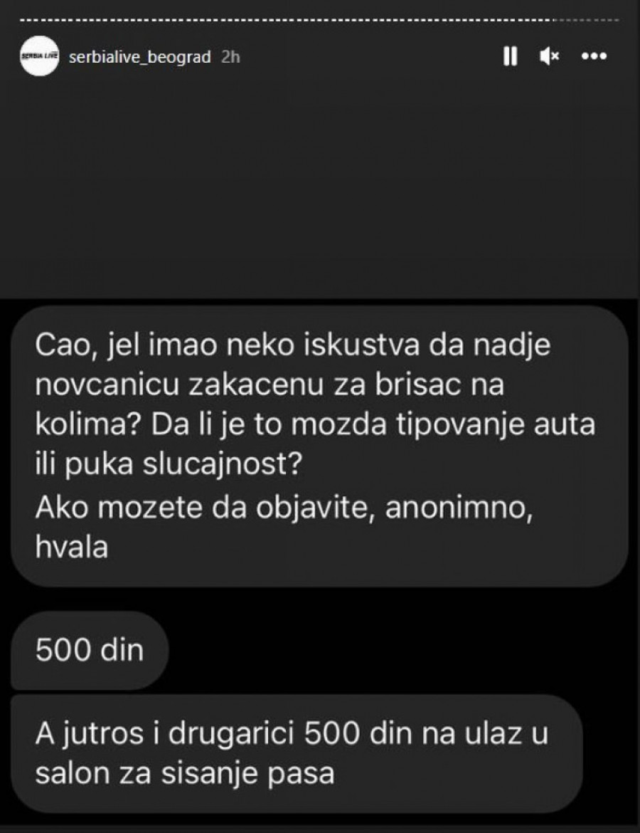 - Jel ima neko iskustva da je nađe novčanicu zakačenu za brisač na kolima? Da li je to možda tipovanje auta ili puka slučajnost - napisala je Beograđanka na Instagram stranici serbialive_beograd i dodala da je u pitanju novčanica od 500 dinara.