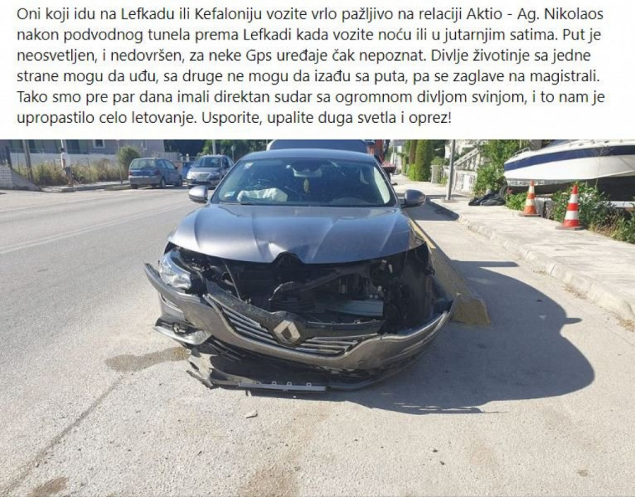 "Oni koji idu na Lefkadu ili Kefaloniju vozite vrlo pažljivo na relaciji Aktio - Ag. Nikolaos nakon podvodnog tunela prema Lefkadi kada vozite noću ili u jutarnjim satima. Put je neosvetljen, i nedovršen, za neke GPS uređaje čak nepoznat. Divlje životinje sa jedne strane mogu da uđu, sa druge ne mogu da izađu sa puta, pa se zaglave na magistrali. Tako smo pre par dana imali direktan sudar sa ogromnom divljom svinjom, i to nam je upropastilo celo letovanje. Usporite, upalite duga svetla i oprez!", napisao je on.