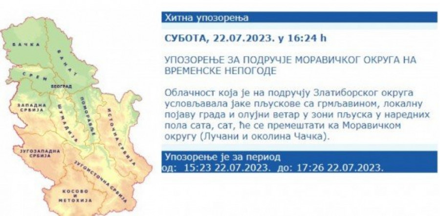 Republički hidrometeorološki zavod (RHMZ) izdao je hitno upozorenje.