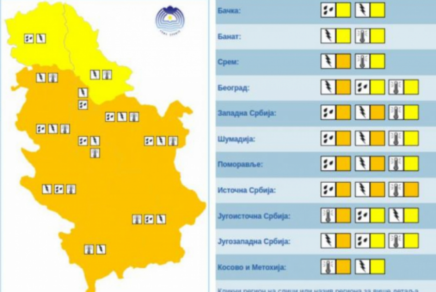 U nedelju je, prema najnovijem meteoalarmu objavljenom na sajtu RHMZ, skoro cela Srbija je u narandžastom meteoalarmu i to zbog kiše, grmljavine i visokih temperatura, u zavisnosti od dela Srbije.