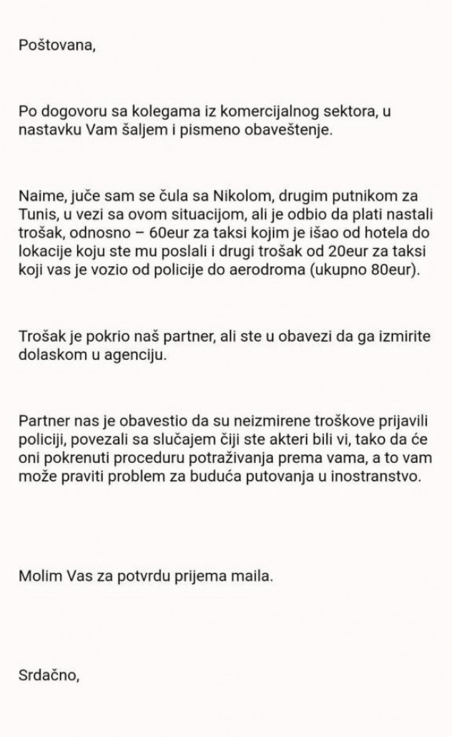- Od strane našeg predstavnika u Tunisu obavešteni smo o navedenom slučaju. Odmah nakon saznanja, kontaktirali smo lokalne partnere na destinaciji koji su odmah došli u hotel u kom su boravili putnici koji su otputovali u organizaciji naše agencije. Uprava hotela je pravovremeno reagovala na sve navode, i o ovom slučaju obavestila nadležne organe Tunisa, uključujući i policiju, koji su dalje sproveli sve neophodne radnje. Nakon par sati obavešteni smo, od strane lokalnog parnera i naših predstavnika na destinaciji, a prema informacijama zvaničnih organa, da je putnica sve vreme boravka u Tunisu bila bezbedna i da će se vratiti planiranim letom u Beograd, prema programu putovanja, što se i dogodilo. Detaljnije informacije u vezi sa ovim slučajem, mogu dati Ambasada Tunisa u Beogradu, Ambasada Srbije u Tunisu i Ministarstvo spoljnih poslova Republike Srbije.