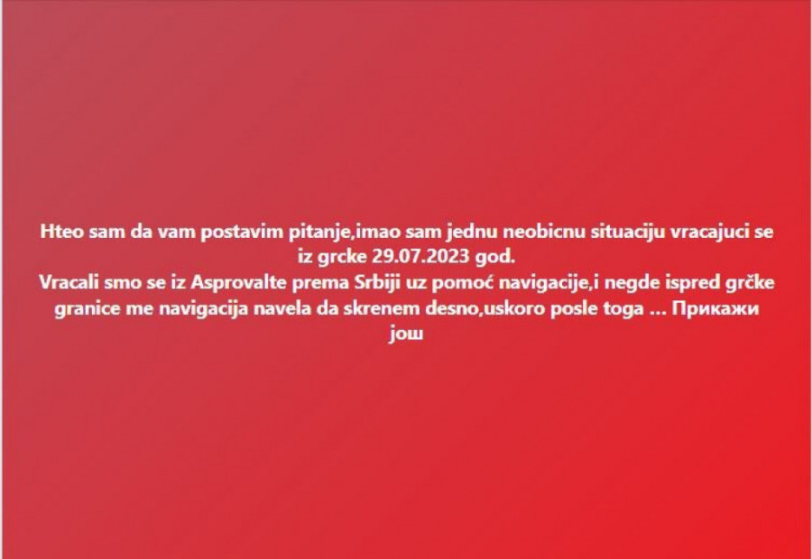 - Vraćali smo se iz Asprovalte prema Srbiji uz pomoć navigacije i negde ispred grčke granice me navigacija navela da skrenem desno. Uskoro posle toga prolazimo neki terminal za kamione, vaga za merenje kamiona, vidim da sam pogrešio, ali nastavljam pravo slušajući navigaciju. I posle izlazimo na makedonsku granicu, bukvalno sam zaobišao grčku granicu bez zaustavljanja, bez ikakve kontrole, pregleda pasoša... Pitanje je da li mogu da imam neke posledice zbog toga? Da napomenem, bili smo sa dva auta, i dalje do kuće nismo imali nikakve probleme na makedonskoj i srpskoj granici - napisao je na Fejsbuk grupi Grčka info.