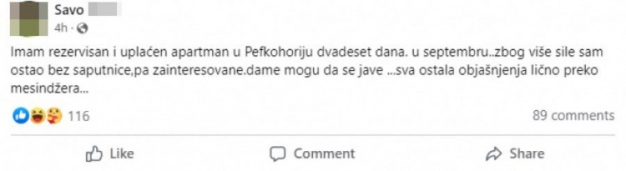 Naime, obratio se korisnicima ove društvene mreže u nadi da će naći saputnicu za letovanje u septembru, ali način na koji je to objavio kod mnogih korisnika je izazvao različite reakcije.