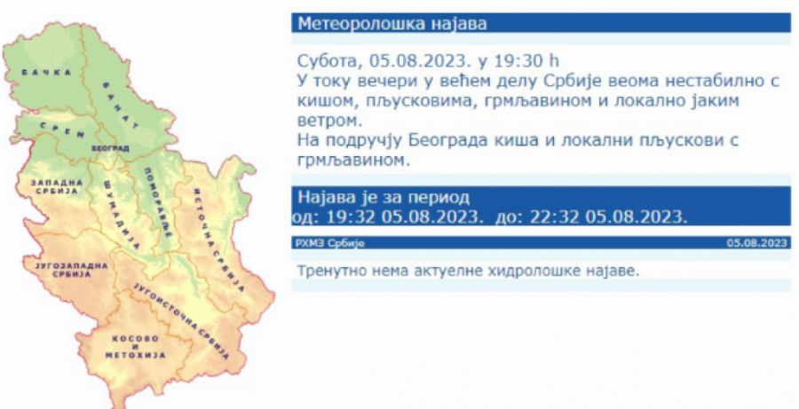 Prema najavi Republičkog hidrometeorološkog zavoda (RHMZ), večeras u većem delu Srbije očekuje se veoma nestabilno vreme, koje će biti praćeno kišom, pljuskovima, grmljavinom i lokalno jakim vetrom.