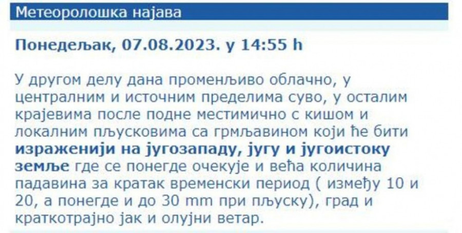 - Posle podne i uveče u Srbiji promenljivo oblačno, mestimično s kišom i lokalnim pljuskovima sa grmljavinom koji će biti izraženiji na jugozapadu, jugu i jugoistoku zemlje gde se ponegde očekuje i veća količina padavina za kratak vremenski period, grad i kratkotrajno jak i olujni vetar - objavio je danas RHMZ.