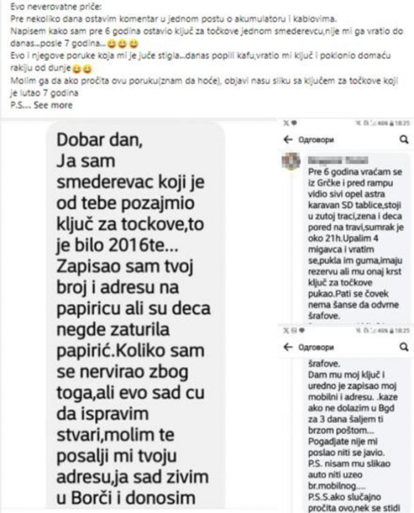 Napišem kako sam pre šest godina ostavio ključ za točkove jednom Smederevcu, nije mi ga vratio do danas...Posle 7 godina...Danas popili kafu,vratio mi ključ i poklonio domaću rakiju od dunje. Molim ga da ako pročita ovu poruku (znam da hoće), objavi našu sliku sa ključem za točkove koji je lutao sedam godina. Kaže, čitao i on post o akumulatoru i bacio pogled na komentare i video moj komentar... - piše Beograđanin na grupi "Live from Greece".