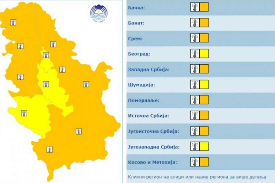 Za područje Beograda, Šumadije i jugozapadnog dela Srbije, meteo-alarm je žute boje, što ukazuje na potencijalno opasne vremenske uslove. Maksimalna temperatura za ova područja očekuje se da će dostići 32 stepena Celzijusa.