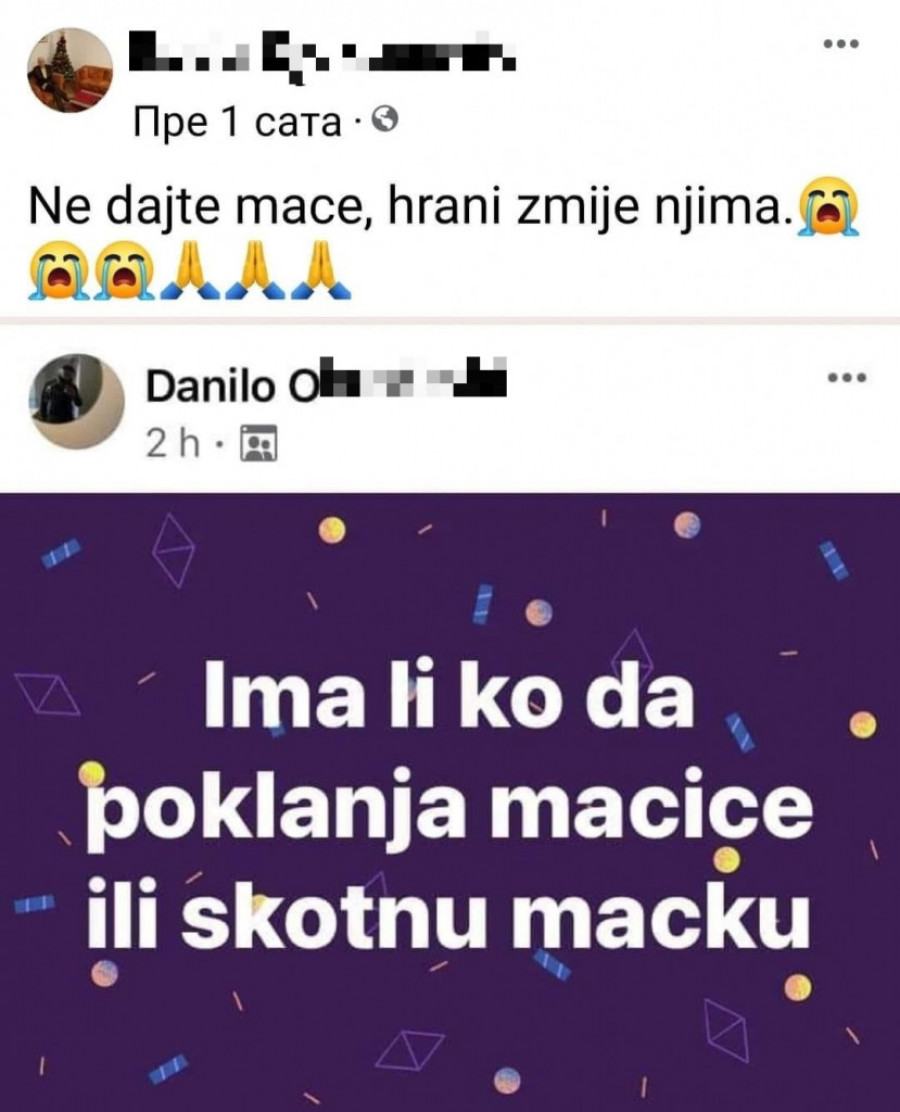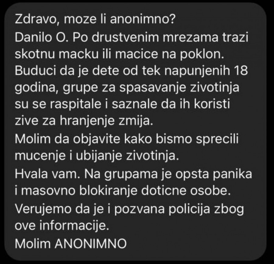 - Danilo O. po društvenim mrežama traži skotnu mačku ili mačiće na poklon. Budući da je dete od tek napunjenih 18 godina, grupe za spasavanje životinja su se raspitale i saznale da ih koristi žive za hranjenje zmija - navodi se u anonimnoj objavi!