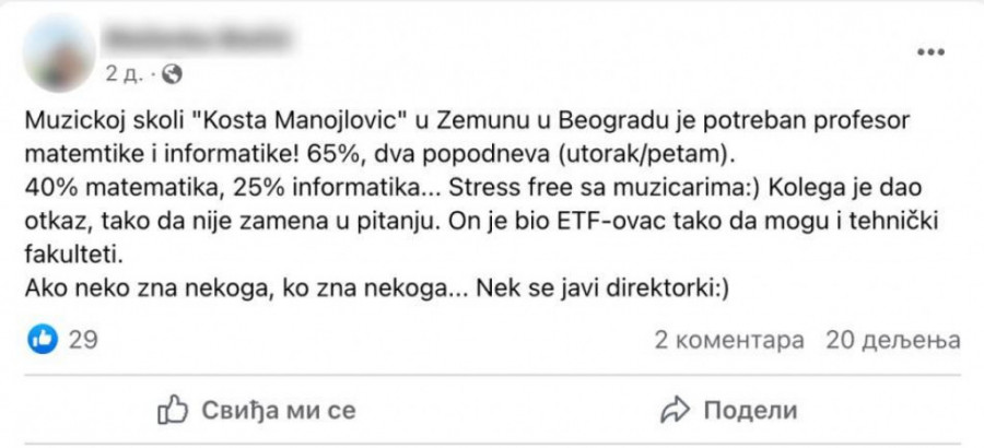 "Muzičkoj školi "Kosta Manojlović" u Zemunu u Beogradu je potreban profesor matematike i informatike! 65%, dva popodneva (utorak/petak). 40% matematika, 25% informatika... Stress free sa muzičarima:) Kolega je dao otkaz, tako da nije zamena u pitanju. On je bio ETF-ovac tako da mogu i tehnički fakulteti. Ako neko zna nekoga, ko zna nekoga... Nek se javi direktorki:)", stoji u objavi na Fejsbuku.