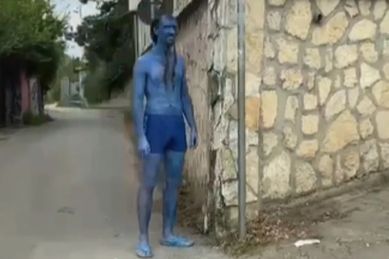 U Sremskoj Kamenici, Srbija, zabeležena je neobična scena u kojoj je jedan muškarac u potpunosti ofarban plavom bojom privukao pažnju prolaznika.