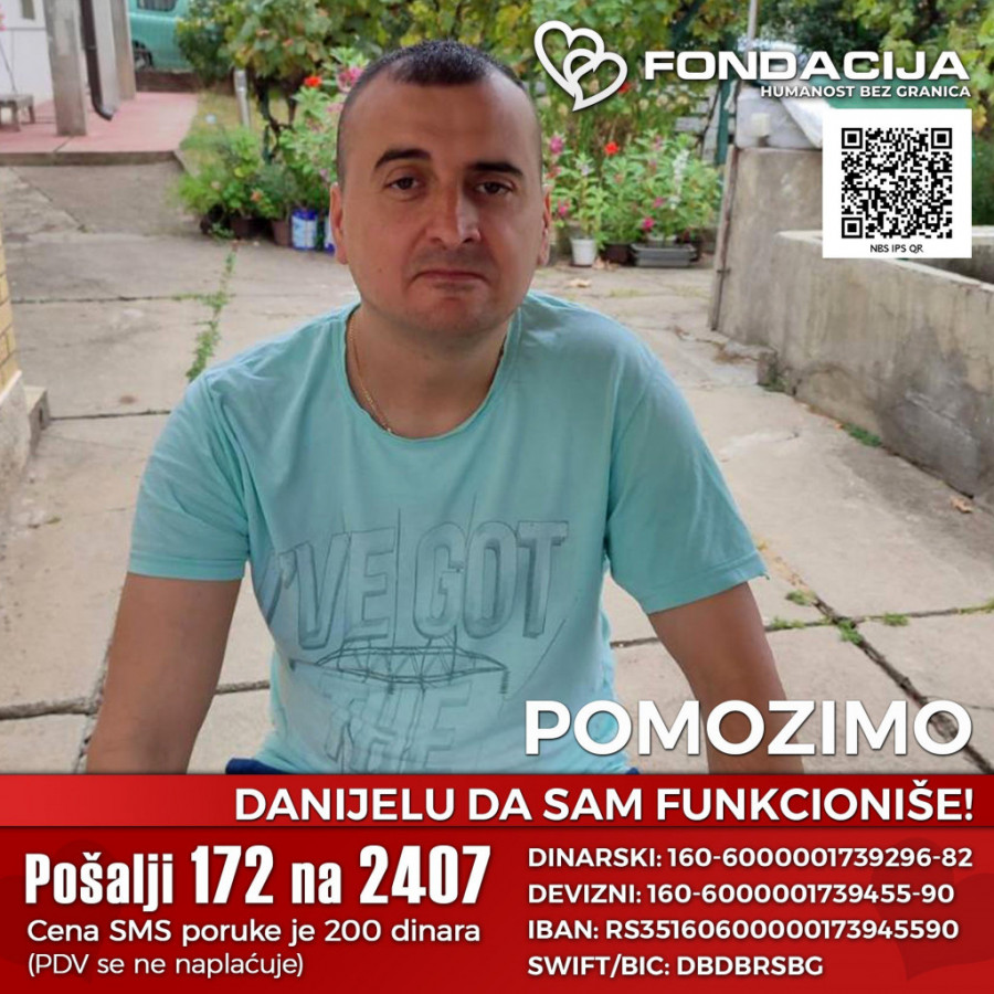 Ovim putem pozivamo sve da pomognu Danijelu da sam fukcioniše, tako što će preko FONDACIJE – humanost bez granica poslati SMS sa brojem 172 na 2407. Uplate za pomoć u lečenju mogu se izvršiti i na dinarski i devizni račun korisnika i putem E-doniraj internet plaćanjem platnim karticama iz celog sveta, kao i preko PayPal-a.
