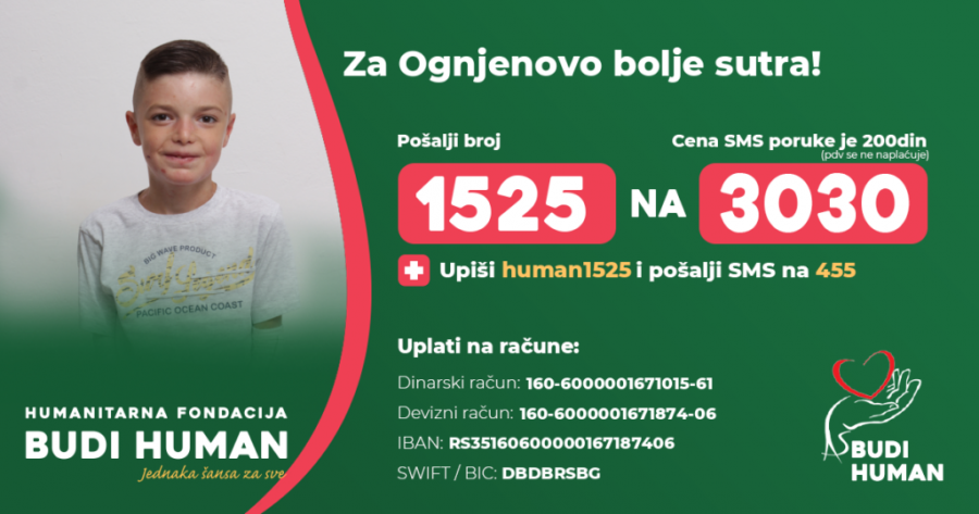 Desetogodišnji Ognjen Bojković boluje od bulozne epidermiolize, retkog oboljenja kože koja je nežna, osetljiva i oštećuje se i na najmanji dodir. Za njegovo lečenje u inostranstvu potrebna su ogromna finansijska sredstva.
