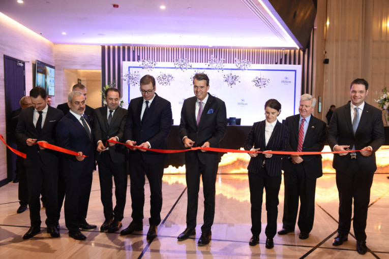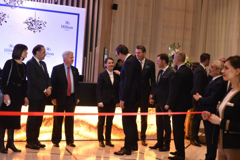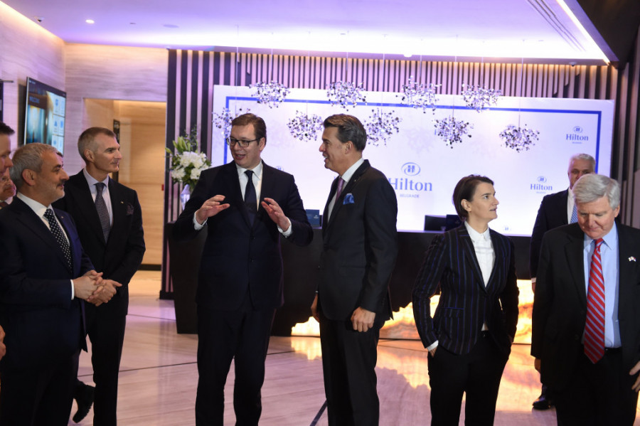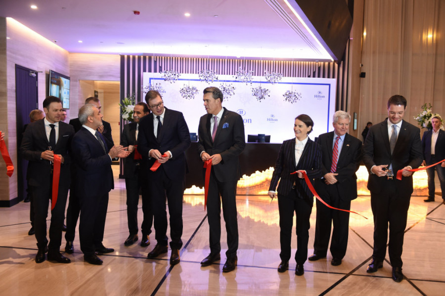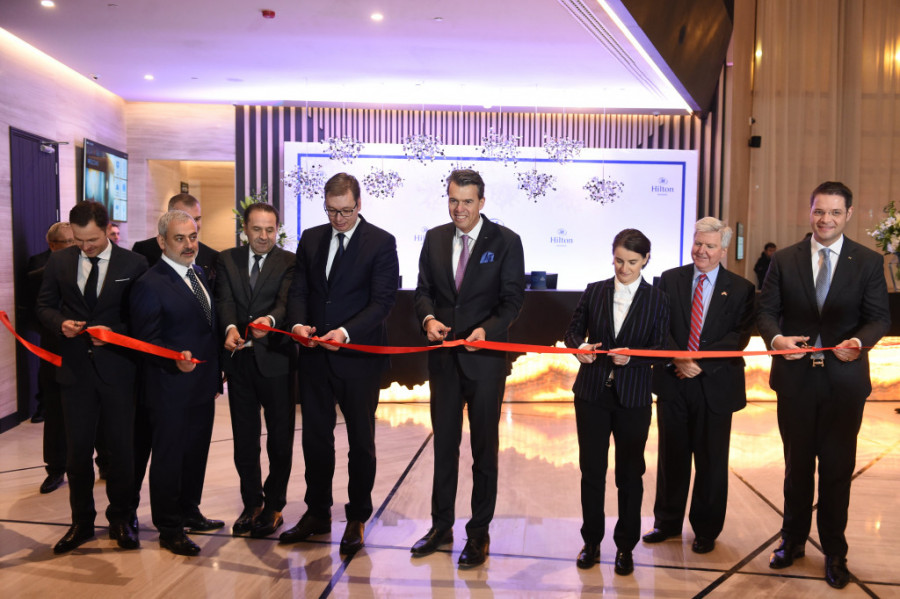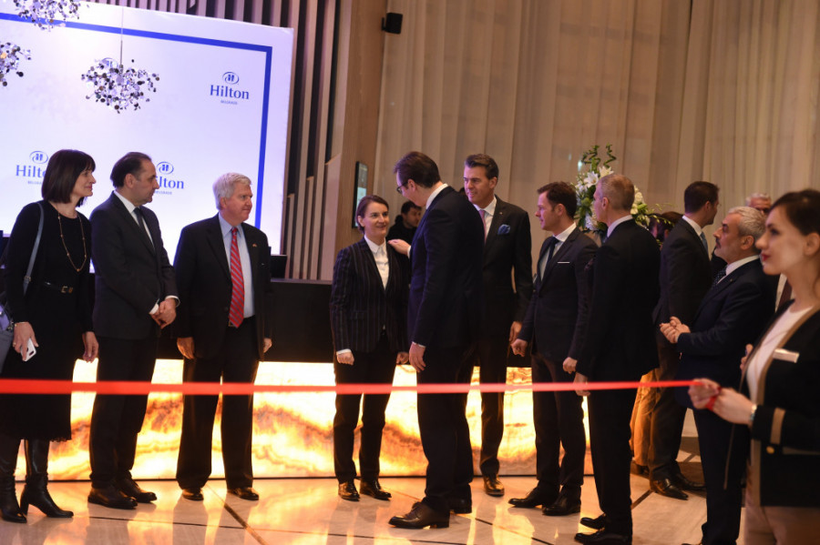Foto: Tanjug/D. KUJUNDŽIĆPredsednik Vučić je presekao vrpcu zajedno sa premijerkom Anom Brnabić, ministrom turizma Rasimom Ljajićem, gradonačelnikom Beograda Sinišom Malim, ambasadorom SAD Kajlom Skotom, potpredsednikom kompanije ''Hilton'' za Evropu Johem-Janom Šlajferom, predstavnikom kompanije "Belaga Management Belgrade" Zlatkom Zdunjićem i generalnim menadžerom "Hilton Belgrade" Nikolasom Huvertom.