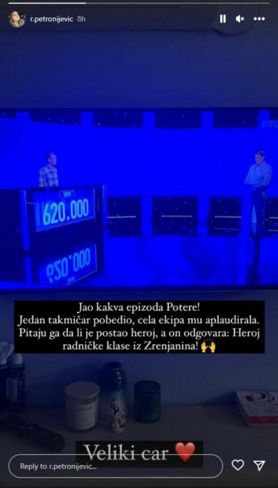 - Jao, kakva epizoda "Potere"! Jedan takmičar pobedio, cela ekipa mu aplaudirala. Pitaju ga da li je postao heroj, a on odgovara: "Heroj radničke klase iz Zrenjanina" - napisala je bivša voditeljka i podelila komentar na Instagram storiju uz fotografiju Jovanovića iz emisije.