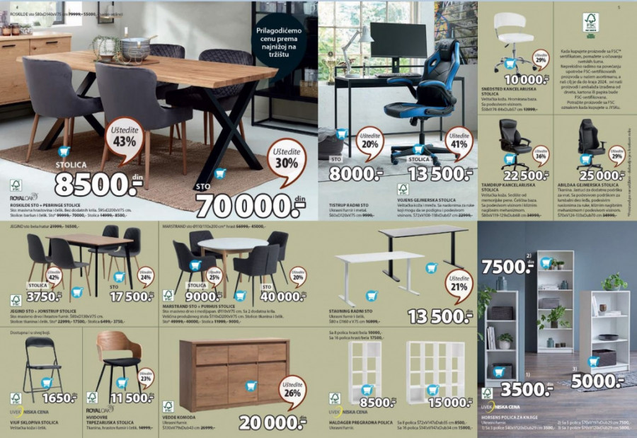 - Otišla sam u obližnji autlet JYSK i na ulasku me je sačekala reklama "specijalna akcija". U ponudi je bio komplet sto bastrup i stolice ravnebake. Kako je bilo navedeno, ukoliko se uzme komplet navodno snižena cena je bila 66.999 dinara. Pored toga, stajala je i pojedinačna cena proizvoda, po kojoj je sto koštao 35.000, a stolica 5.500 dinara po komadu. Prostom matematičkom računicom može se utvrditi da je pojedinačna kupovina za gotovo 10.000 dinara manja od lažne akcijske ponude.