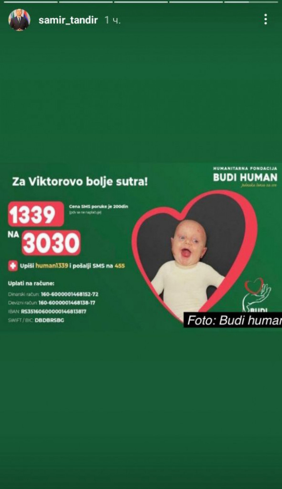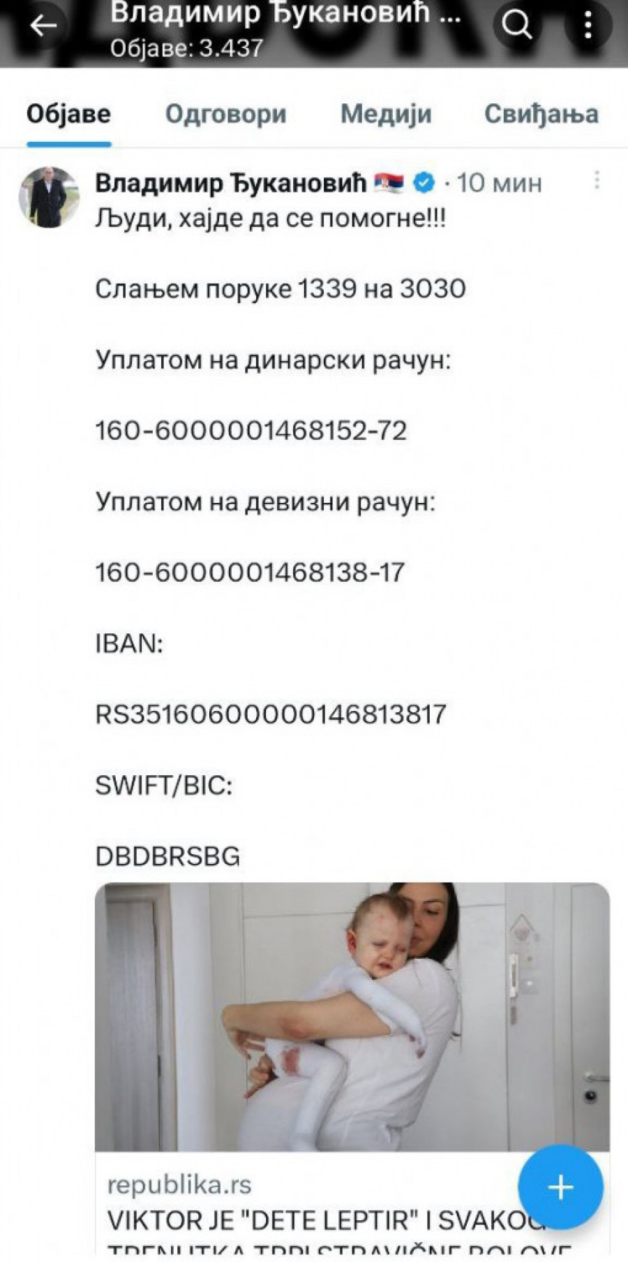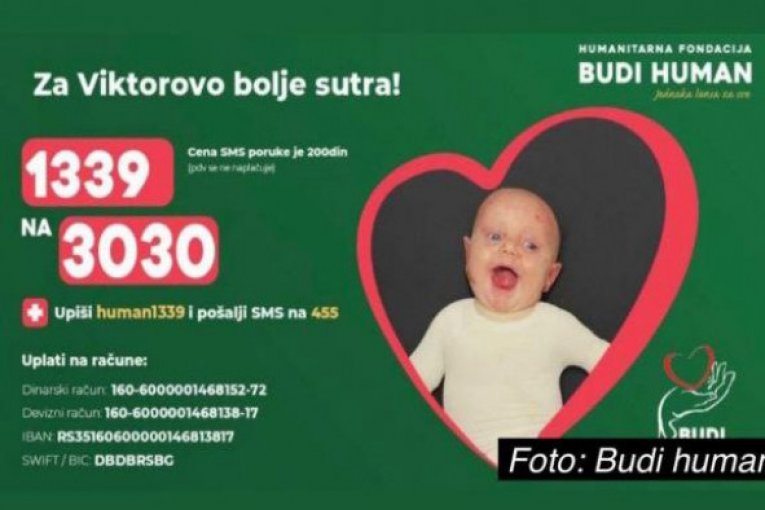 U akciju prikupljanja novčane pomoći uključili su se i naš list i portal Srpski telegraf i Republika, pa ovom prilikom apelujemo na sve ljude dobre volje koji imaju mogućnosti da pomognu Viktorovo lečenje uplatom ili slanjem poruke 1339 na 3030. Našem listu i portalu u ovoj akciji priključio se i veliki broj političara, javnih i estradnih ličnosti, sportista, koji su na društvenim mrežama pozvali ljude da pomognu za Viktorovo bolje sutra.
