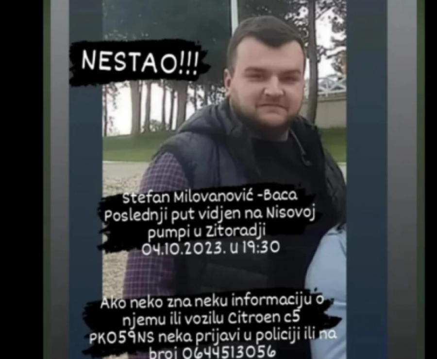 Stefan Milovanović (29) nestao je sinoć u Žitorađi. Njegov brat Dušan je potvrdio da je Stefan poslednji put viđen nakon što je završio smenu na pumpi gde je zaposlen.