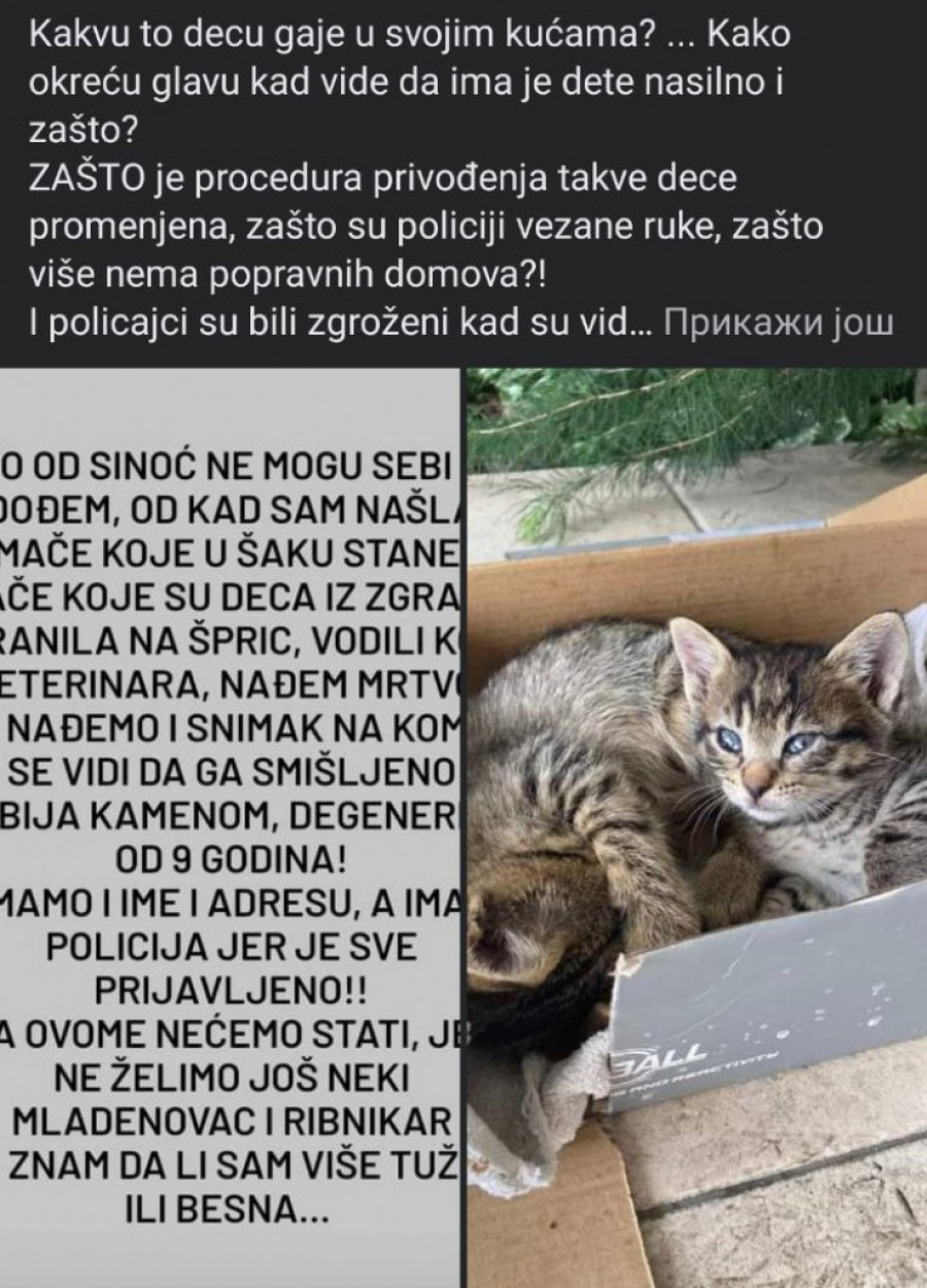 - Od sinoć ne mogu sebi da dođem, od kada sam našla mače koje u šaku stane, mače koje su deca iz zgrade hranila na špric, vodili kod veterinara, nađem mrtvo. Nađemo i snimak na kome se vidi da ga smišljeno ubija kamenom, degeneriok od devet, deset godina! Imamo ime i adresu, a ima i policija jer je sve prijavljeno! Na ovome nećemo stati, jer ne želimo još neki Mladenovac i Ribnikar. Ne znam da li sam više tužna ili besna.