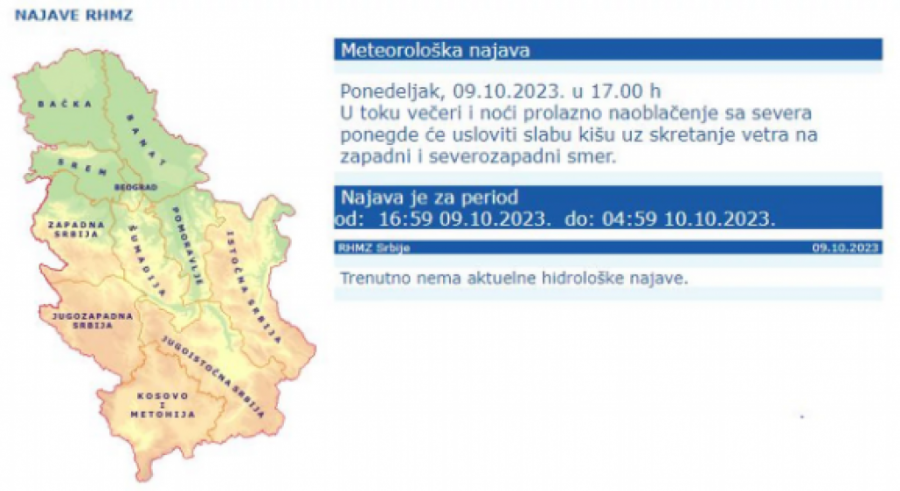 Republički hidrometeorološki zavod Srbije izdao je danas u 17 časova meteorološku najavu.