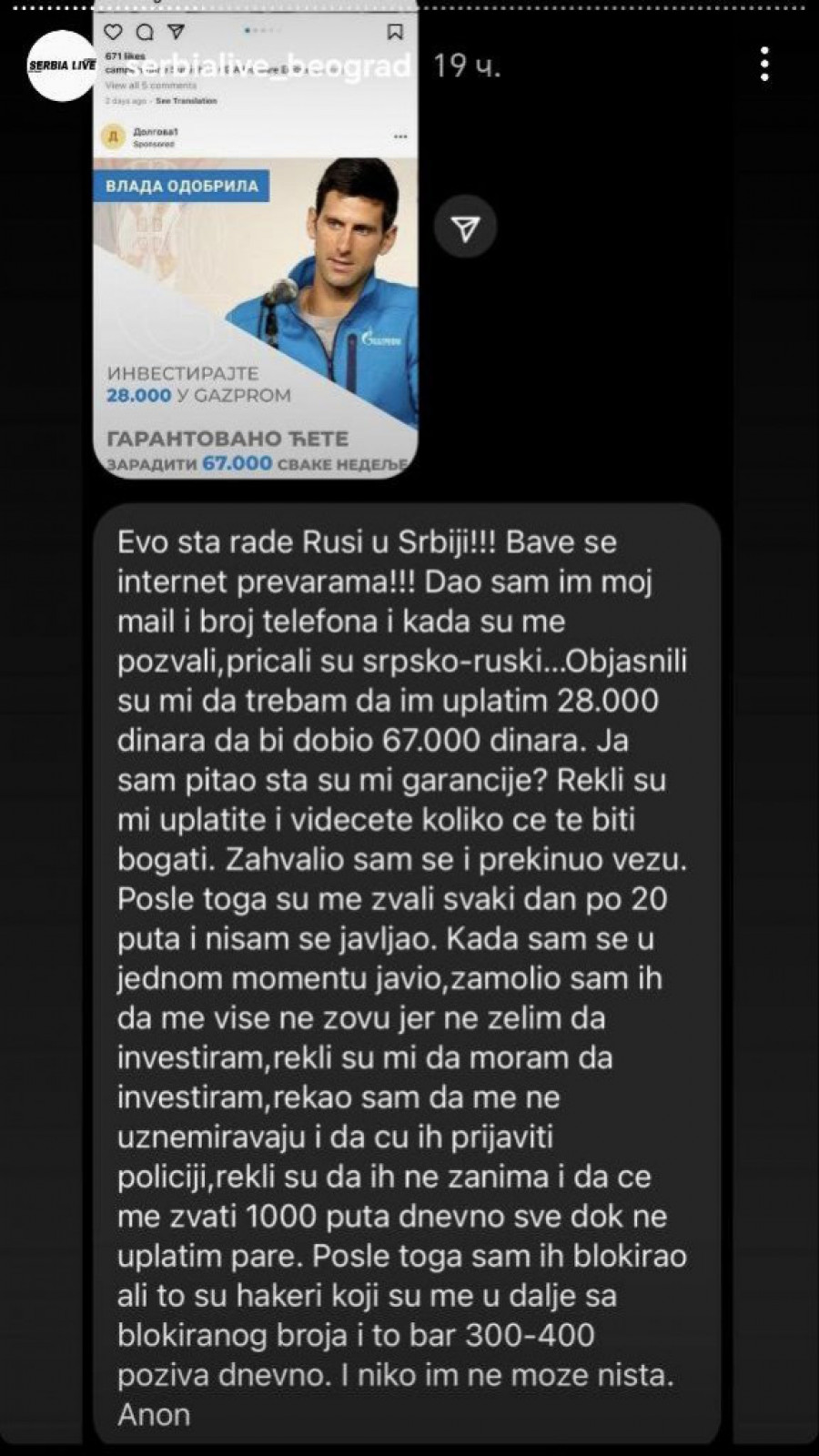 - Evo šta rade Rusi u Srbiji! Bave se internet prevarama! Dao sam im moj mail i broj telefona i kad su me pozvali , pričali su srpsko-ruski... Objasnili su mi da treba da im platim 28.000 dinara da bi dobio 67.000 dinara. Ja sam pitao šta su mi garancije? Rekli su mi uplatite i videćete koliko ćete biti bogati. Zahvalio sam se i prekinuo vezu. Posle toga su me zvali svaki dan po 20 puta i nisam se javljao - zavapio je on na Instagramu.