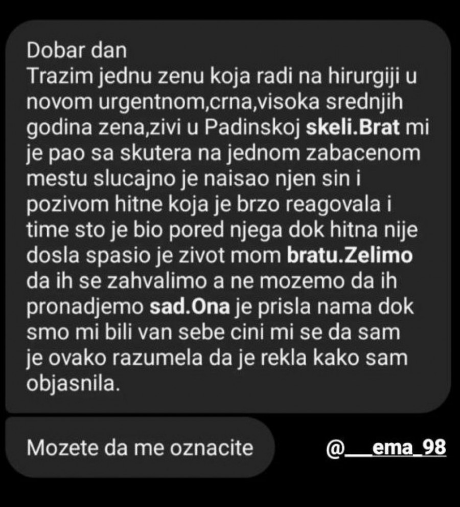 - Tražim jednu ženu koja radi na hirurgiji u novom urgentnom, crna, visoka, srednjih godina. Žena živi u Padinskoj skeli. Brat mi je pao sa skutera na jednom zabačenom mestu, slučajno je naišao njen sin i pozivom hitne koja je brzo reagovala i time što je pored njega, dopk hitna nije došla, spasio je život mom bratu. Želimo da im se zahvalimo, a ne možemo da ih nađemo sad. Ona je prišla nama dok smo mi bili van sebe, čini mi se da sam je ovako razumela - istakla je jedna devojka na Instagram stranici Serbia live Beograd.