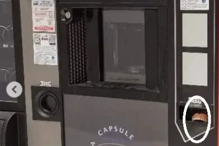 Na slici, koja je objavljena na Instagram strani "moj_beo_grad_" vidi se totalna proteza, po svoj prilici za gornju vilicu, koja stoji u delu kafemata gde bi po pravilu trebalo da bude izbačen kusur.