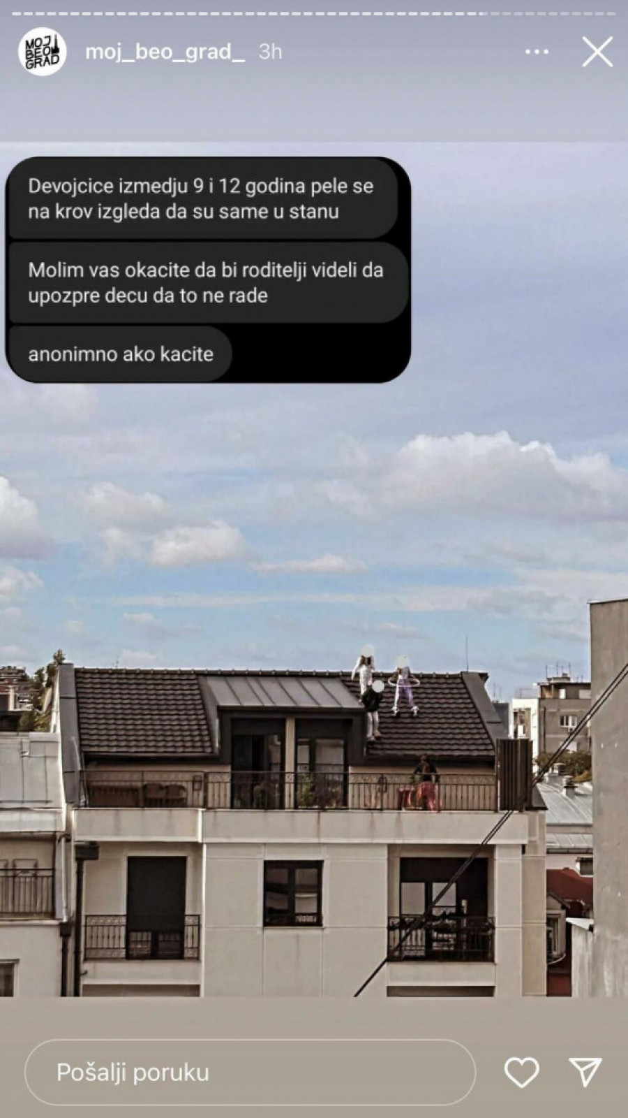 Na Instagram stranici "Moj_beo_grad_" objavljena je fotografija na kojoj se vide tri devojčice koje su se popele na krov jedne stambene zgrade, a jedna od njih je čak imala i obruč oko struka. Foto: Printscreen Instagram moj_beo_grad