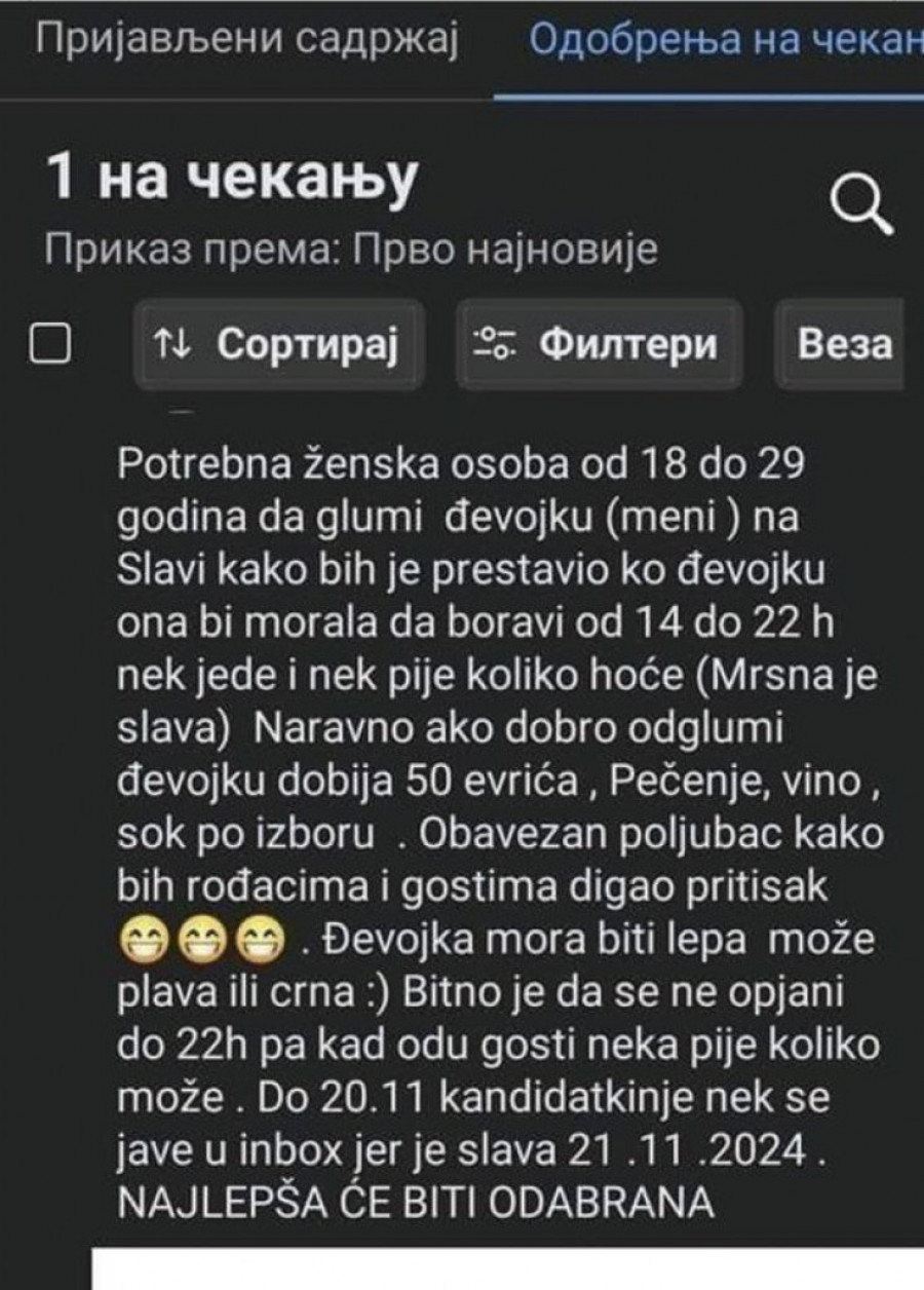 - Potrebna ženska osoba od 18 do 29 godina da glumi devojku (meni) na slavi kako bih je prestavio kao devojku. Ona bi morala da boravi od 14 do 22 h nek jede i nek pije koliko hoće (Mrsna je slava) Naravno, ako dobro odglumi đevojku dobija 50 evrića, pečenje, vino, sok po izboru. Obavezan poljubac kako bih rođacima i gostima digao pritisak • Devojka mora biti lepa može plava ili crna :) Bitno je da se ne opjani do 22h pa kad odu gosti neka pije koliko moze. Do 20.11 kandidatkinje nek se jave u inbox jer je slava 21.11.2024. NAJLEPŠA ĆE BITI ODABRANA - glasio je urnebesan oglas.