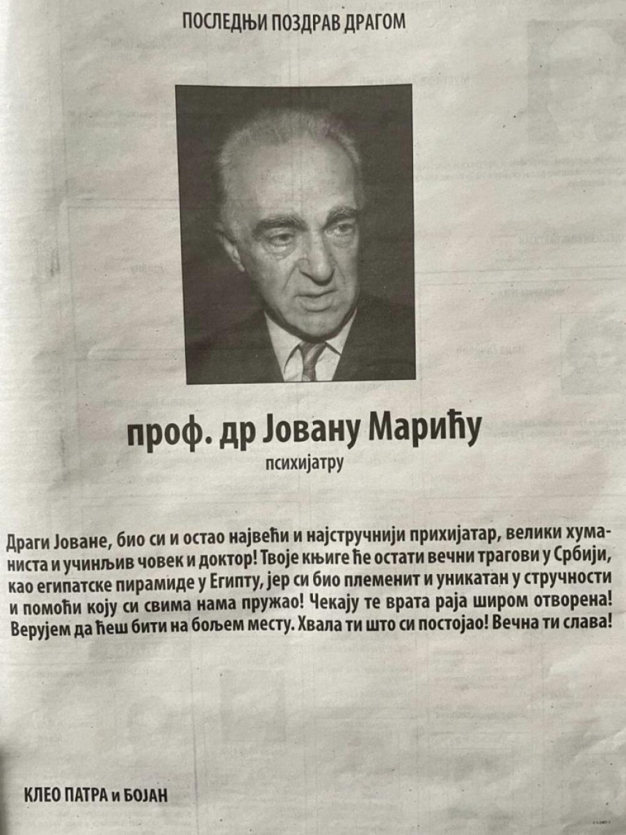 U Novinama je osvanula čitulja pokojnom psihijatru Jovanu Mariću koja je šokirala mnoge, a evo ko ju je dao.