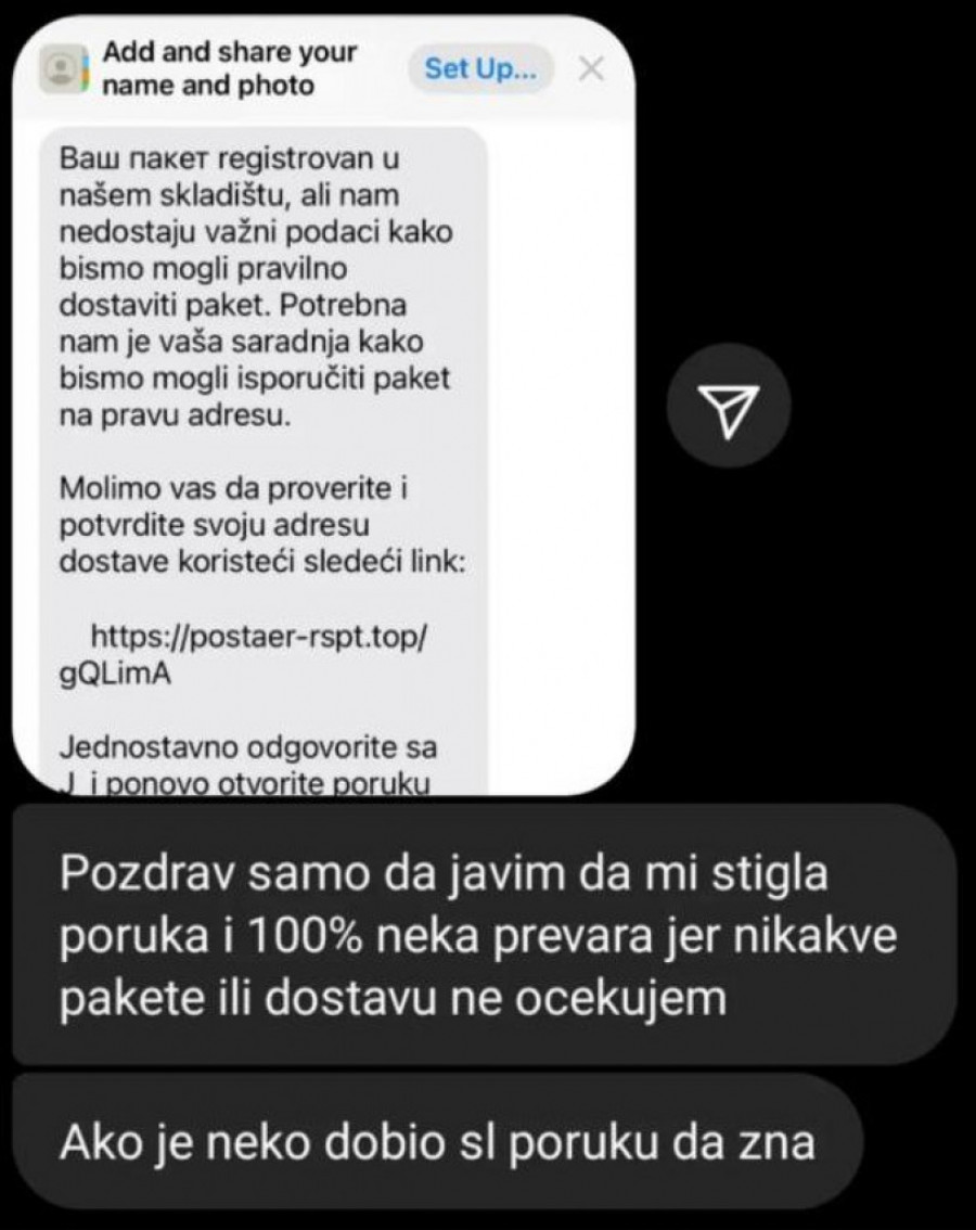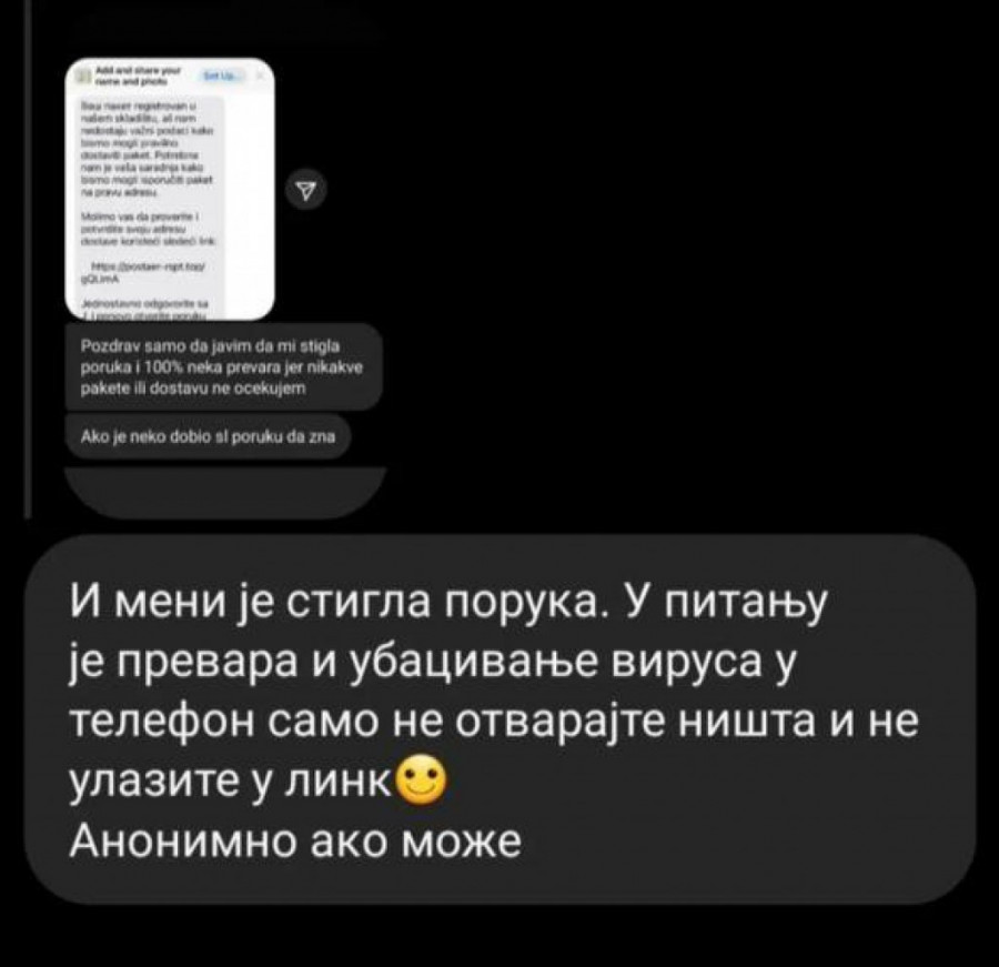 - Samo da javim da mi je stigla poruka i 100 odsto je neka prevara jer nikakve pakete ili dostavu ne očekujem. Ako je neko dobio sličnu poruku da zna - navodi jedan od korisnika Instagrama.