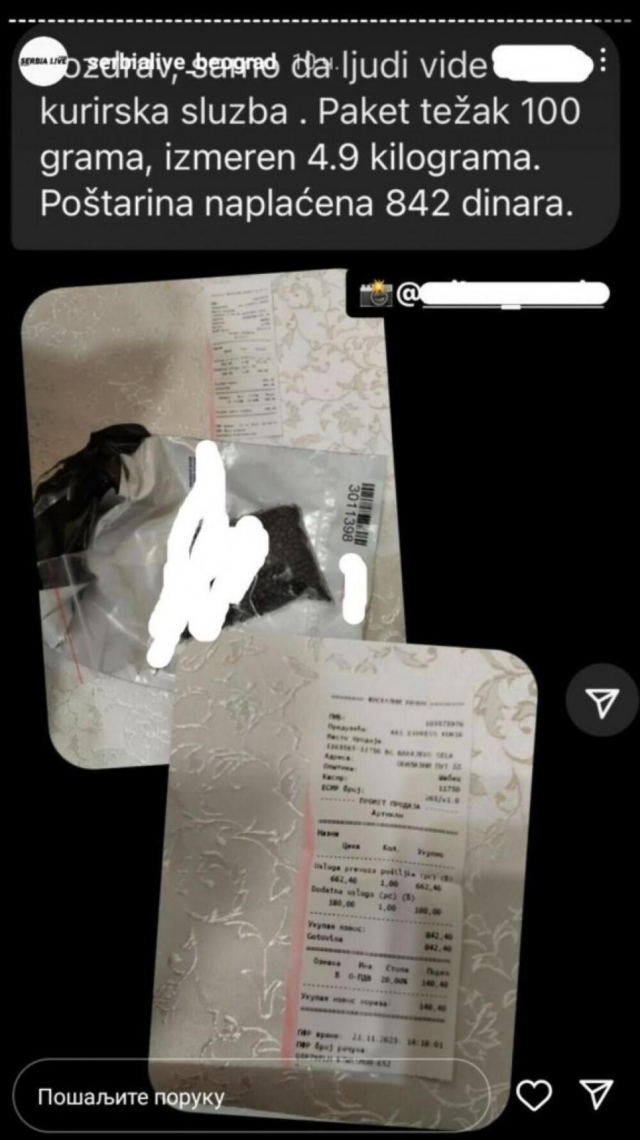 Na Instagram stranici Serbia Lajv Beograd pojavila se objava jednog Beograđanina koji se žali na kurirsku službu koja mu je naplatila previsoku cenu poštarine za paket težine 100 grama. Naime, paket je izmeren kao da teži 4,9 kilograma, što je Beograđanin smatra nepravednim i prevaram. Foto: Printscreen/Instagram/serbialive_beograd