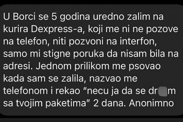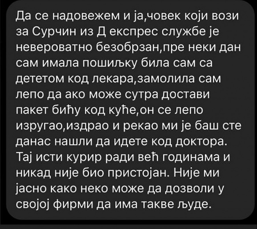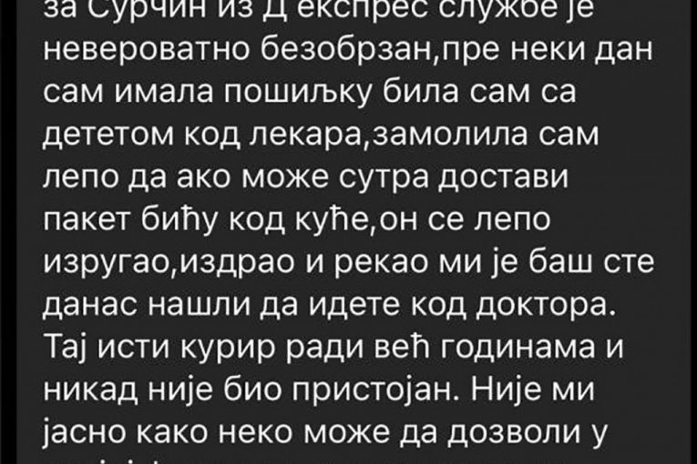 - Čovek koji vozi za Surčin iz Dexpressslužbe je neverovatno bezobrazan. Pre neki dan imala pošiljku, bila sma sa detetom kod lekara. Zamolila sam lepo da ako može sutra dostavi paket, biću kod kuće. On se lepo izrugao, izdrao i rekao "baš ste danas našli da idete kod doktora". Taj isti kurir radi već godinama i nikada nije bio pristojan - iskustvo je jedne Beograđanke objavljeno na Instagram stranici Serbialive_beograd.