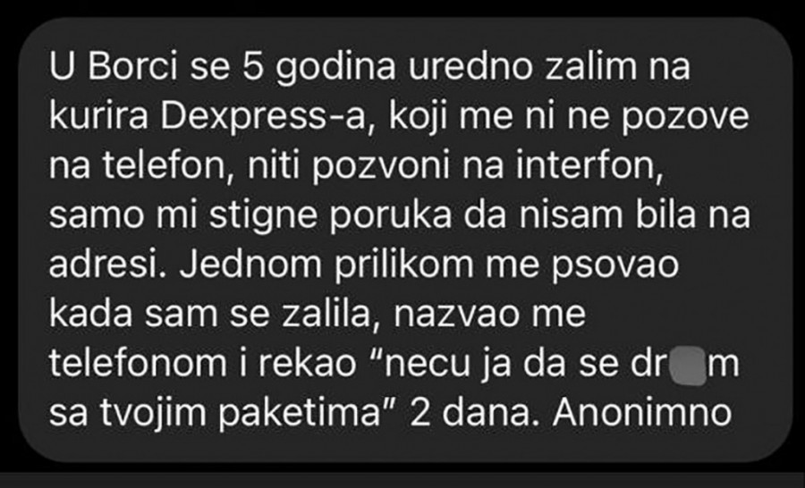 - Dexpress kuriri neće da čekaju ni 3 minuta da izađeš na ulicu, niti da dođu do stana. Ne zanima ih ni da li si sam sa bebom, psuju kad im kažeš da dođu do vratai vraćaju pošiljke. Naravno ne javlja se niko na call centar - istakla je jedna Beograđanka.